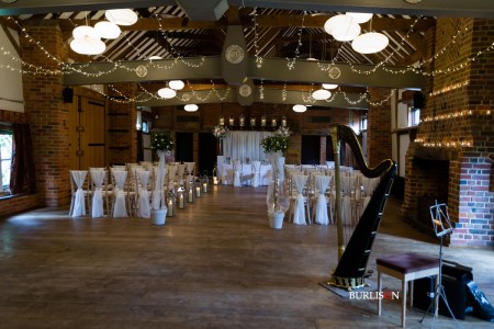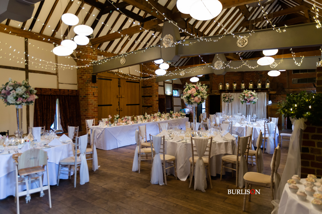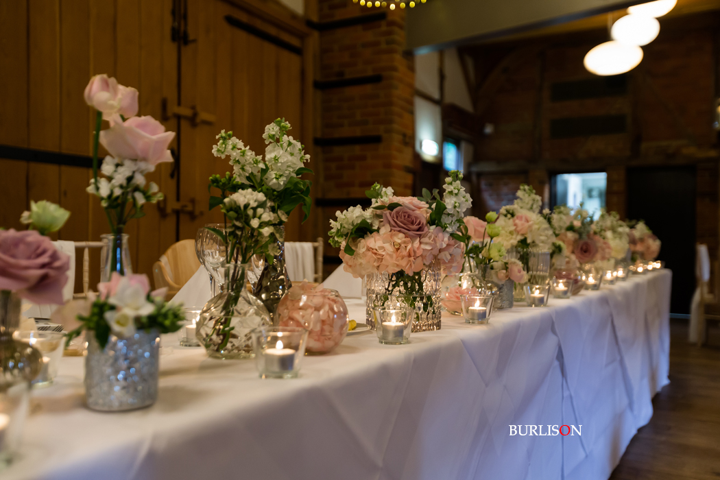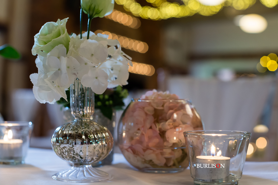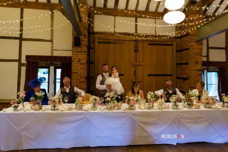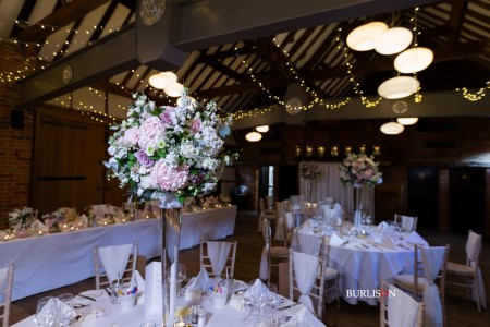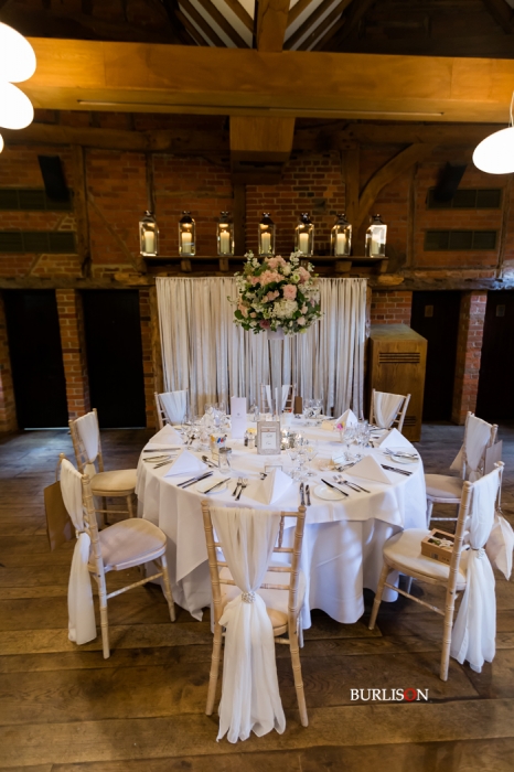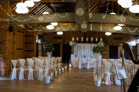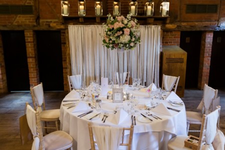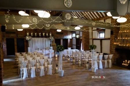 The Dawley Barn looked amazing with Flowers by Exclusively Weddings. Chair covers, draped backdrop and stationary by Laurel Designs.