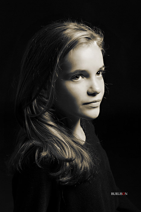 The session is planned with complete simplicity in kind. Clothing is kept dark to maximise the impact of the image. The concept is for the face to be the main feature of the portrait, so a low-key effect is created. This is the most emotional style of portraiture and as such is always presented in a beautiful Fine Art, black & white framed format.